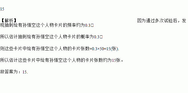 ÏÖÓÐ50ÕÅ´óС¡¢Öʵؼ°±³ÃæÍ¼°¸¾ùÏàͬµÄ¡¶Î÷Óμǡ·ÈËÎ│Ƭ,ÕýÃæ³¯Ï·ÅÖÃÔÚ×ÀÃæÉÏ,´ÓÖÐËæ»ú³éȡһÕŲ¢¼ÇÏ¿¨Æ¬ÕýÃæËù»æÈËÎïµÄÃû×ÖºóÔÑù·Å»Ø,Ï´ÔȺóÔÙ³é.ͨ¹ý¶à´ÎÊÔÑéºó,·¢Ïֳ鵽»æÓÐËïÎò¿ÕÕâ¸öÈËÎ│ƬµÄƵÂÊԼΪ0.3.¹À¼ÆÕâЩ¿¨Æ¬ÖлæÓÐËïÎò¿ÕÕâ¸öÈËÎïµÄ¿¨Æ¬ÕÅÊýԼΪ____.