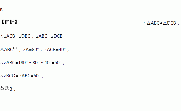 B 【解析】∵△ABC≌△DCB, ∴∠ACB=∠DBC,∠ABC=∠DCB, △ABC中,∠A=80°,∠ACB=40°, ∴∠ABC=180°﹣80°﹣40°=60°, ∴∠BCD=∠ABC=60°, 故选B.