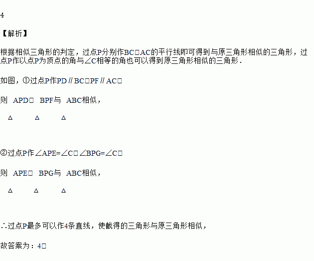 如图,点是的边上的一点,过点作一直线,把三角形分成两部分,使截得的三角形与原三角形相似,这种直线最多可作________条.