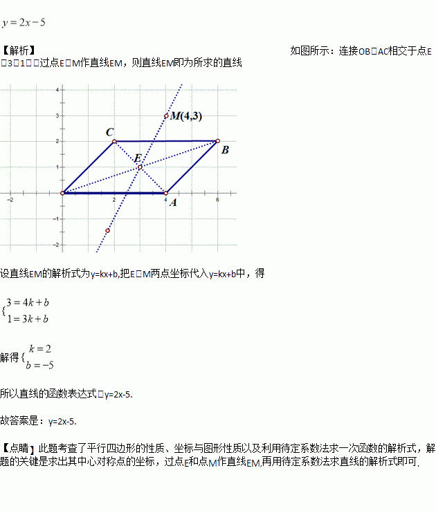 如图,在平面直角坐标系xOy中,四边形OABC是平行四边形,且A(4,0)、B(6,2)、M(4,3).在平面内有一条过点M的直线将平行四边形OABC的面积分成相等的两部分,请写出该直线的函数表达式______________________.