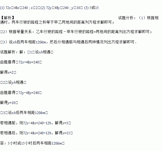 (1) 72x+48x=240 ; x=2;(2) 72y-48y=240 ; y=10; (3) 5或15 【解析】试题分析:(1)根据相遇时,两车行驶的路程之和等于甲乙两地间的距离列方程求解即可; (2)根据等量关系:乙车行驶的路程﹣甲车行驶的路程=两地间的距离列出方程求解即可; (3)设xh后两车相距120km,然后分相遇前与相遇后两种情况列出方程求解即可. 试题解析...