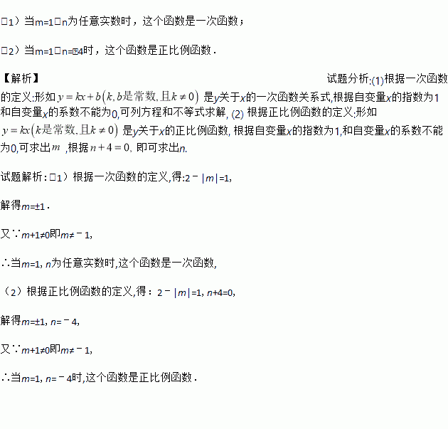 (1)当m=1,n为任意实数时,这个函数是一次函数; (2)当m=1,n=﹣4时,这个函数是正比例函数. 【解析】试题分析:(1)根据一次函数的定义:形如是y关于x的一次函数关系式,根据自变量x的指数为1和自变量x的系数不能为0,可列方程和不等式求解, (2) 根据正比例函数的定义:形如是y关于x的正比例函数, 根据自变量x的指数为1,和自变量x的系数不能为0,可求出,根据即可求出n....