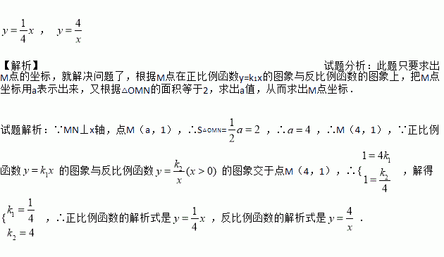 已知正比例函数的图像与反比例函数 ()的图像交于点M(a,1),MN⊥x轴于点N,若⊿OMN的面积等于2,求这两个函数的解析式。