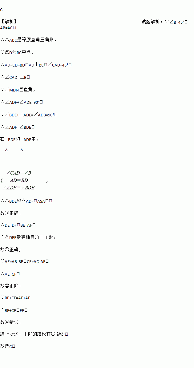C 【解析】试题解析:∵∠B=45°,AB=AC, ∴△ABC是等腰直角三角形, ∵点D为BC中点, ∴AD=CD=BD,AD⊥BC,∠CAD=45°, ∴∠CAD=∠B, ∵∠MDN是直角, ∴∠ADF+∠ADE=90°, ∵∠BDE+∠ADE=∠ADB=90°, ∴∠ADF=∠BDE, 在△BDE和△ADF中, , ∴△B...
