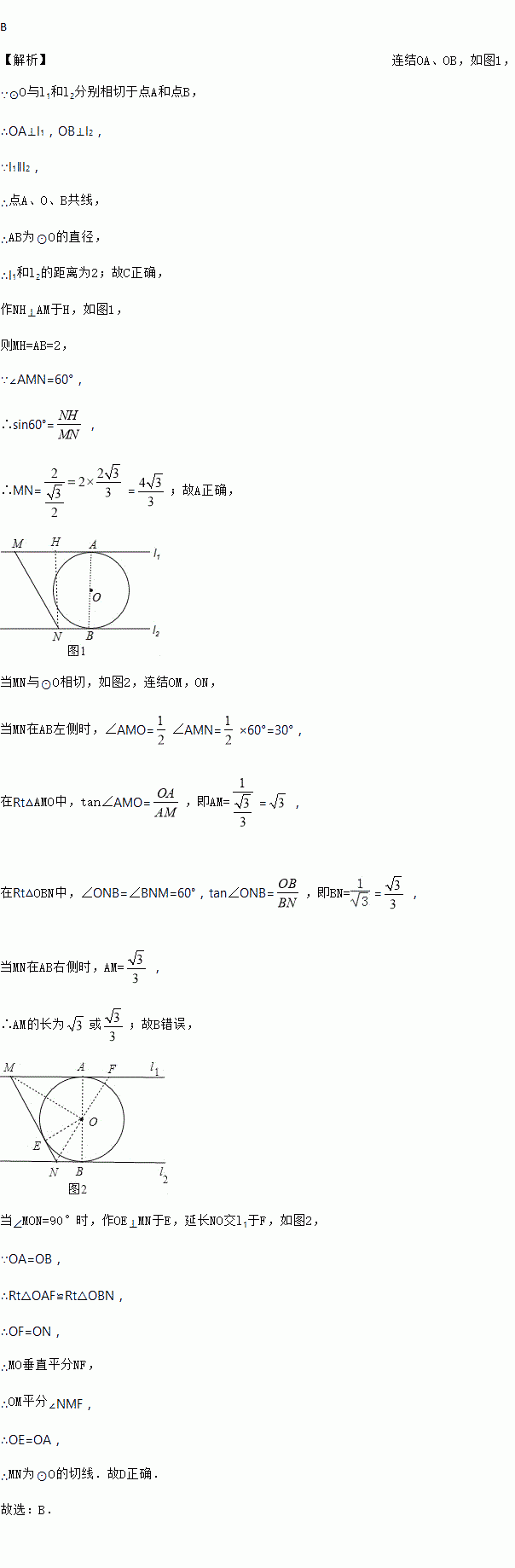 如图,直线l1∥l2,⊙O与l1和l2分别相切于点A和点B,点M和点N分别是l1和l2上的动点,MN沿l1和l2平移,若⊙O的半径为1,∠1=60°,下列结论错误的是( )