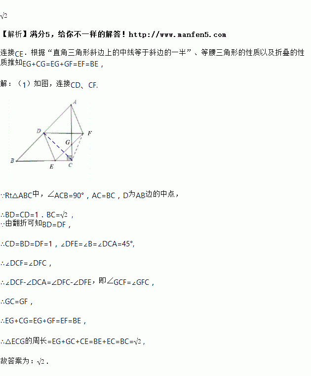 如图,△ABC中,∠ACB=90°,AB=2,BC=AC,D为AB的中点,E为BC上一点,将△BDE沿DE翻折,得到△FDE,EF交AC于点G,则△ECG的周长是___________.