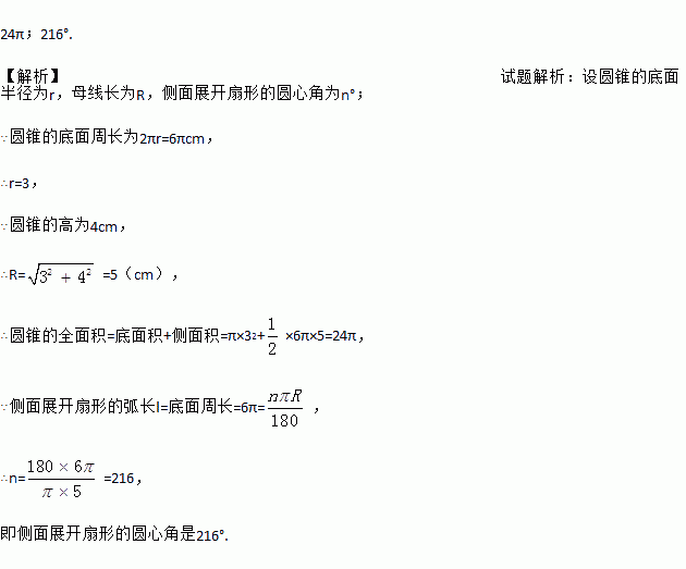 圆锥的底面周长为6πcm,高为4cm,则该圆锥的全面积是 ;侧面展开扇形的圆心角是 .
