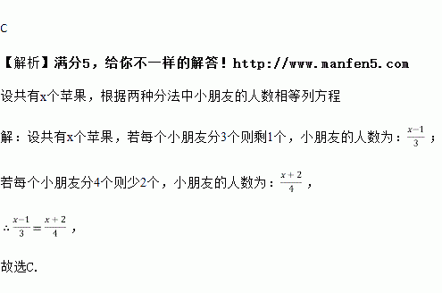 “某幼儿园给小朋友分苹果,若每个小朋友分3个则剩1个;若每个小朋友分4个则少2个,问苹果有多少个?”若设共有x个苹果,则列出的方程是( )