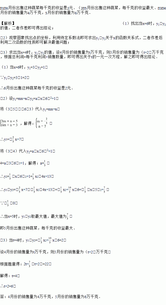 (3)已知市场部销售该种蔬菜4、5两个月的总收益为22万元,且5月份的销售量比4月份的销售量多2万千克,求4、5两个月的销售量分别是多少万千克?