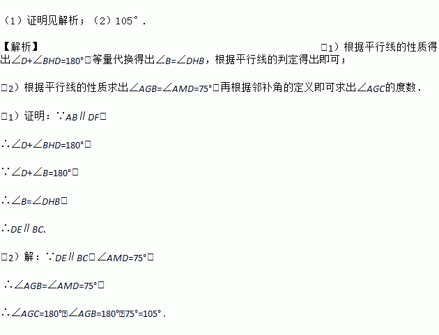 £¨1£©Ö¤Ã÷¼û½âÎö£»£¨2£©105¡ã. ¡¾½âÎö¡¿£¨1£©¸ù¾ÝƽÐÐÏßµÄÐÔÖʵóö¡ÏD+¡ÏBHD=180¡ã£¬µÈÁ¿´ú»»µÃ³ö¡ÏB=¡ÏDHB£¬¸ù¾ÝƽÐÐÏßµÄÅж¨µÃ³ö¼´¿É£» £¨2£©¸ù¾ÝƽÐÐÏßµÄÐÔÖÊÇó³ö¡ÏAGB=¡ÏAMD=75¡ã£¬ÔÙ¸ù¾ÝÁÚ²¹½ÇµÄ¶¨Òå¼´¿ÉÇó³ö¡ÏAGCµÄ¶ÈÊý£® £¨1£©Ö¤Ã÷£º¡ßAB¡ÎDF£¬ ¡à¡ÏD+¡ÏBHD=180¡ã£¬ ¡ß¡ÏD+¡ÏB=180¡ã£¬ ¡à¡ÏB=¡ÏDHB£¬ ¡àD...