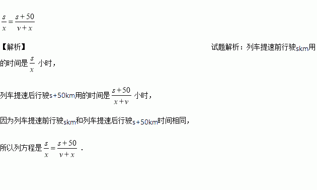 某次列车平均提速vkm/h.用相同的时间,列车提速前行驶s km,提速后比提速前多行驶50 km,设提速前列车的平均速度为x km/h,则列方程为________.