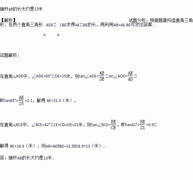 如图,某大楼顶部有一旗杆AB,甲乙两人分别在相距6米的C、D两处测得B点和A点的仰角分别是42°和65°,且C、D、E在一条直线上.如果DE=15米,求旗杆AB的长大约是多少米?(结果保留整数)