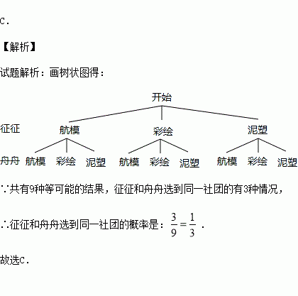 学校新开设了航模、彩绘、泥塑三个社团,如果征征、舟舟两名同学每人随机选择参加其中一个社团,那么征征和舟舟选到同一社团的概率是( )