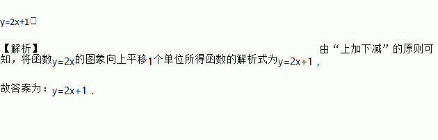 y=2x+1. 【解析】由“上加下减”的原则可知,将函数y=2x的图象向上平移1个单位所得函数的解析式为y=2x+1, 故答案为:y=2x+1.