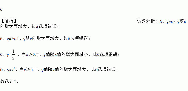 下列函数中,当x>0时,y值随x值的增大而减小的是( )