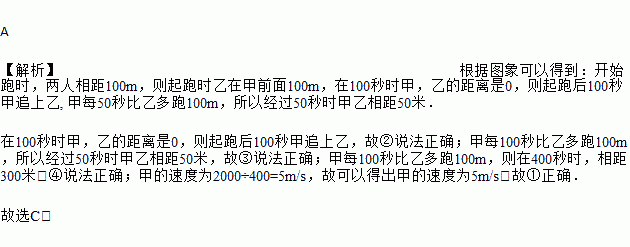 ①甲的速度为5米/秒;②100秒时甲追上乙;③经过50秒时甲乙相距50米;④甲到终点时,乙距离终点300米.其中正确的说法有( )