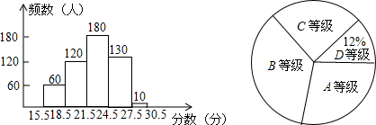 ΪÁËÁ˽âÈ«ÊнñÄê8ÍòÃû³õÖбÏÒµÉúµÄÌåÓýÉýѧ¿¼ÊԳɼ¨×´¿ö£¬£¨Âú·Ö30·Ö£¬µÃ·Ö¾ùÊÇÕûÊý£©Ð¡Ã÷ºÍСÀö´ÓÖÐËæ»ú³éÈ¡Á˲¿·ÖѧÉúµÄÌåÓýÉýѧ¿¼ÊԳɼ¨£¬Ð¡Ã÷Ö±½Ó½«³É¼¨ÖƳÉÏÂÃæÆµÊý·Ö²¼Ö±·½Í¼£¬¶øÐ¡ÀöÔò½«µÃ·Öת»¯ÎªµÈ¼¶£¬¹æ¶¨µÃ·ÖµÍÓÚ18.5·ÖÆÀΪ¡°D¡±£¬18.5¡«21.5·ÖÆÀΪ¡°C¡±£¬21.5¡«24.5·ÖÆÀΪ¡°B¡±£¬24.5·ÖÒÔÉÏÆÀΪ¡°A¡±£¬ÖƳÉÏÂÃæµÄÉÈÐÎͳ¼ÆÍ¼£¬»Ø´ðÏÂÁÐÎÊÌ⣺