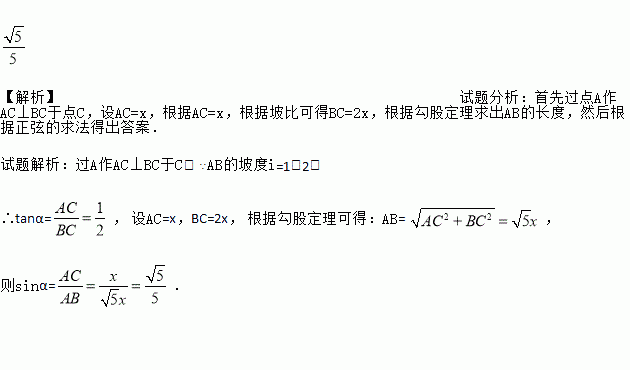 如图所示,一水库迎水坡AB的坡度i=1:2,求坡角α的正弦值sinα