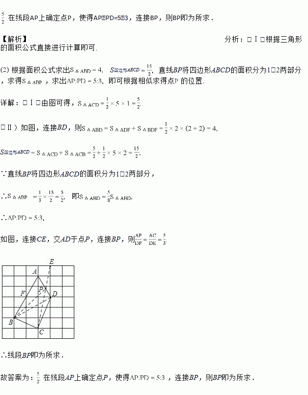 (Ⅱ)现只有无刻度的直尺,请在线段AD上找一点P,并连结BP,使得直线BP将四边形ABCD的面积分为1:2两部分,在图中画出线段BP,并在横线上简要说明你的作图方法._____.