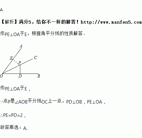 如图,点P是∠AOB平分线OC上一点,PD⊥OB,垂足为D,若PD=2,则点P到边OA的距离是( )