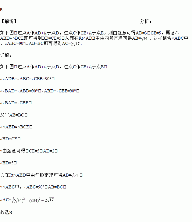 如图,△ABC中,∠ABC=90°,AB=BC,三角形的顶点在相互平行的三条直线l1,l2,l3上,且l1,l2之间的距离为2,l2,l3之间的距离为3,则AC的长是( )
