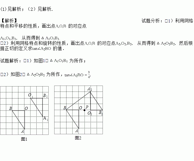 (2)在图2中,△AOB与△A2O2B2是关于点P对称的图形,画出△A2O2B2,连接BA2,并直接写出tan∠A2BO的值.(其中A,O,B的对应点分别为点A2,O2,B2)