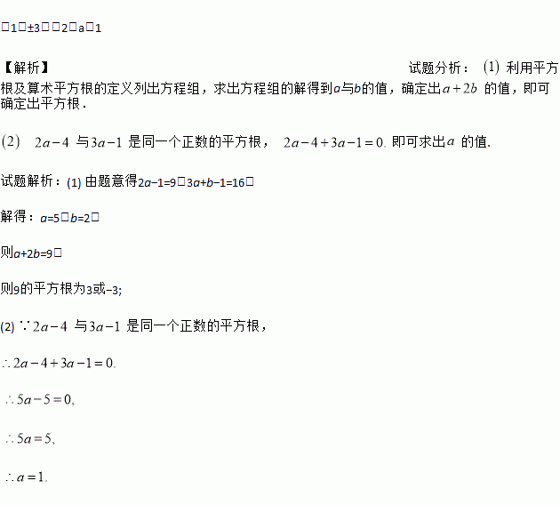 (1)已知2a-1的平方根是±3,3a+b-1的平方根是±4,求a+2b的平方根;