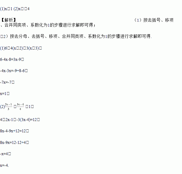 (1)6-4(x+2)=3(x-3); (2)-=1.
