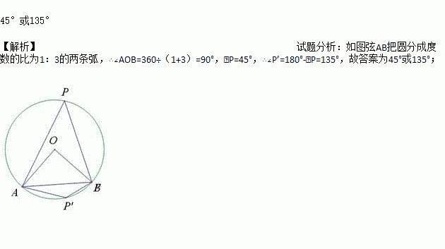 圆的一条弦把圆分成度数的比为1:3的两条弧,则该弦所对的圆周角等于_______.