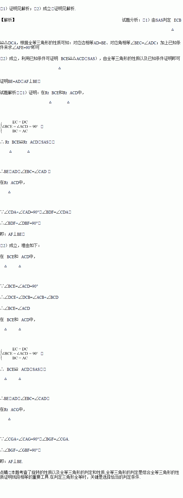 (2)将△ABC绕点C顺时针旋转(如图2),连结BE、AD,AD分别交BE、BC于点F、G,那么(1)中的结论还成立吗?若成立,请证明;若不成立,请说明理由.