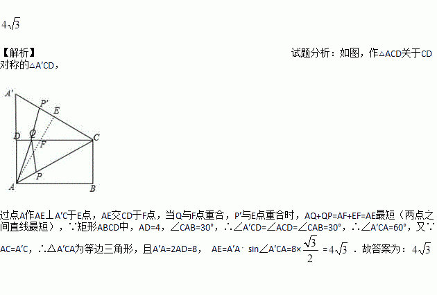 如图,矩形ABCD中,AD=4,∠CAB=30o,点P是线段AC上的动点,点Q是线段CD上的动点,则AQ+QP的最小值是