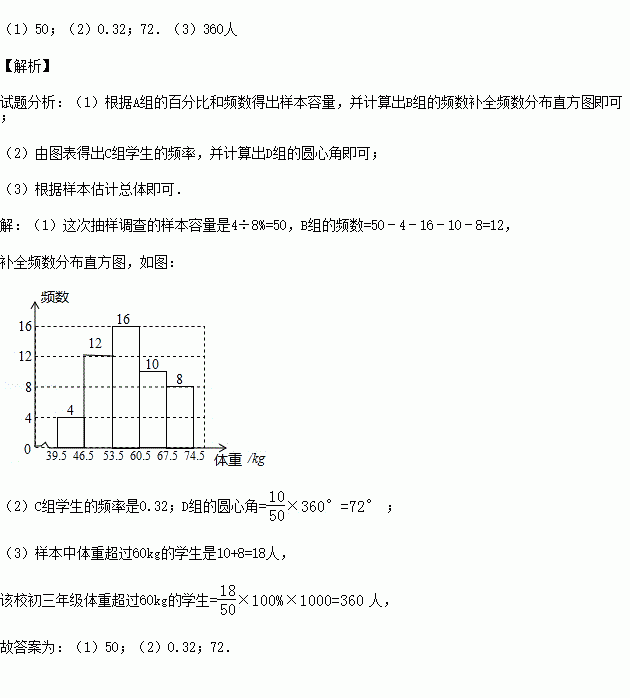 (3)请你估计该校初三年级体重超过60kg的学生大约有多少名?