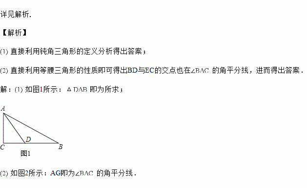 如图1,中,,在三角形的一边上取一点D,画一个钝角;