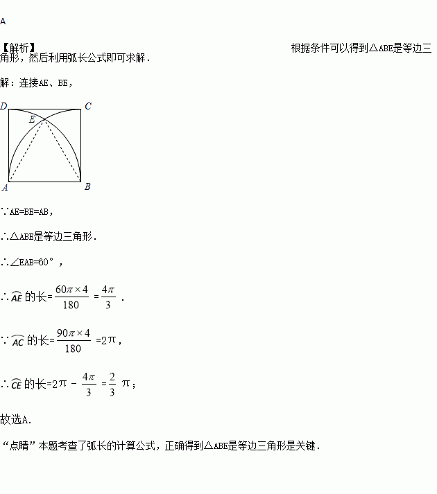 如图,正方形ABCD的边长AB=4,分别以点A、B为圆心,AB长为半径画弧,两弧交于点E,则CE弧的长是( )