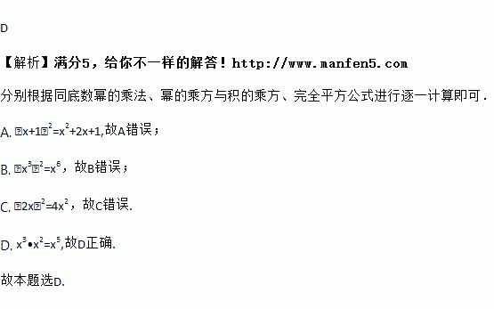 A. (x+1)2=x2+1 B. (x3)2=x5 C. (2x)2=2x2 D. x3•x2=x5