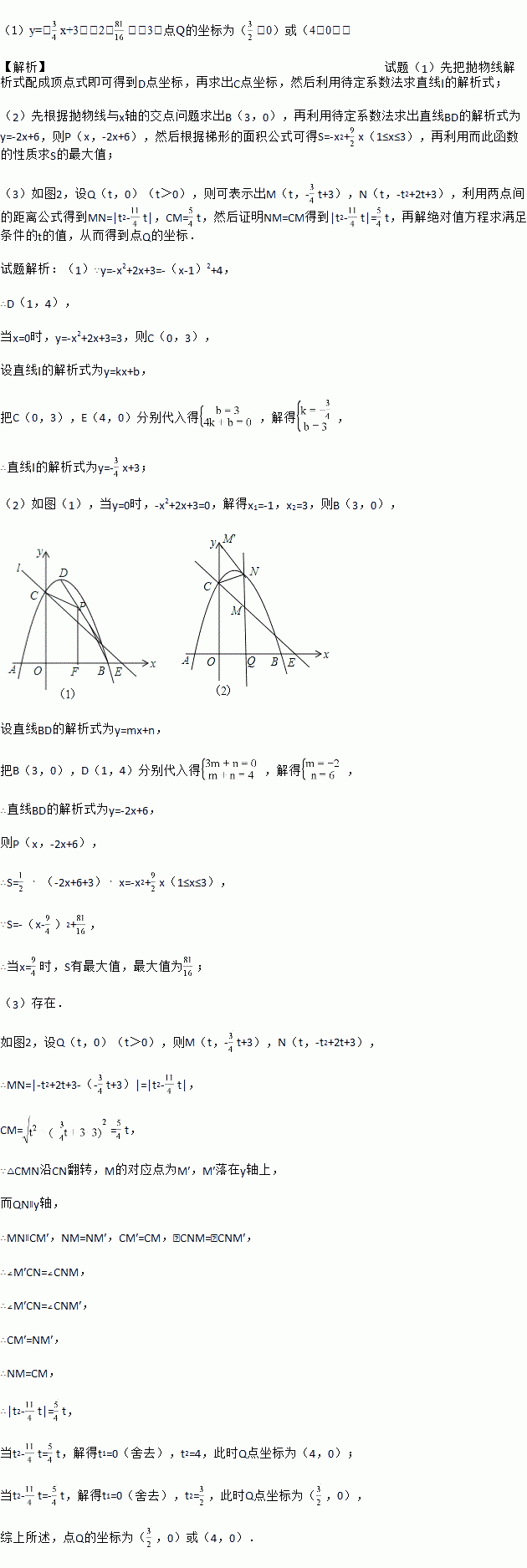 (3)点Q在x轴的正半轴上运动,过Q作y轴的平行线,交直线l于M,交抛物线于N,连接CN,将△CMN沿CN翻转,M的对应点为M′.在图2中探究:是否存在点Q,使得M′恰好落在y轴上?若存在,请求出Q的坐标;若不存在,请说明理由.