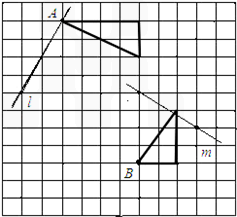 | 解:①如图作一个以A为顶点,直角边在网格上且直角边长分别为4、2的直角三角形,此三角形与l所经过的格点为斜边的直角三角形全等.则新三角形的斜边所在直线即所求直线. ②如图作一个以B为顶点,直角边在网格上且直角边长分别为3、2的直角三角形,此三角形与以m所经过的格点为斜边的直角三角形全等.则新直角三角形的斜边所在直线即所求直线 |