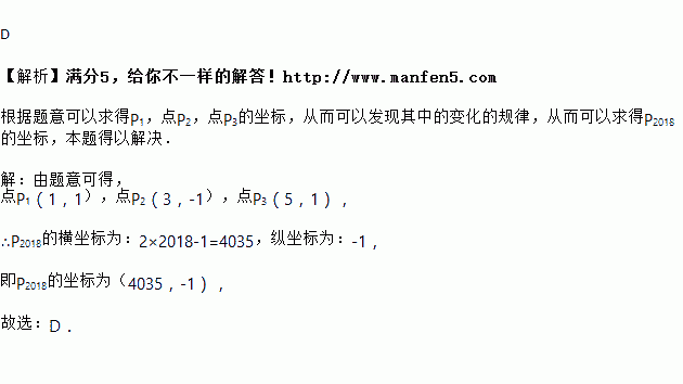 如图所示,在平面直角坐标系中A(0,0),B(2,0),△AP1B是等腰直角三角形,且∠P1=90°,把△AP1B绕点B顺时针旋转180°,得到△BP2C;把△BP2C绕点C顺时针旋转180°,得到△CP3D,依此类推,则旋转第2017次后,得到的等腰直角三角形的直角顶点P2018的坐标为( )