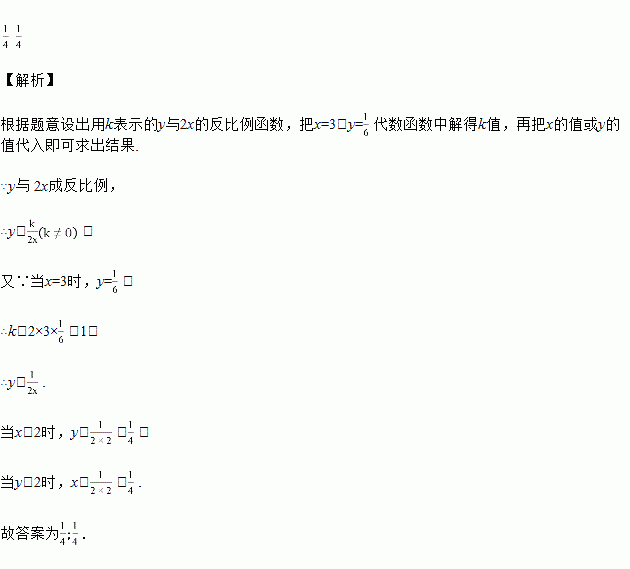 已知y与 2x成反比例,且当x=3时,y=,那么当x=2时,y=_________,当y=2时,x=_________.
