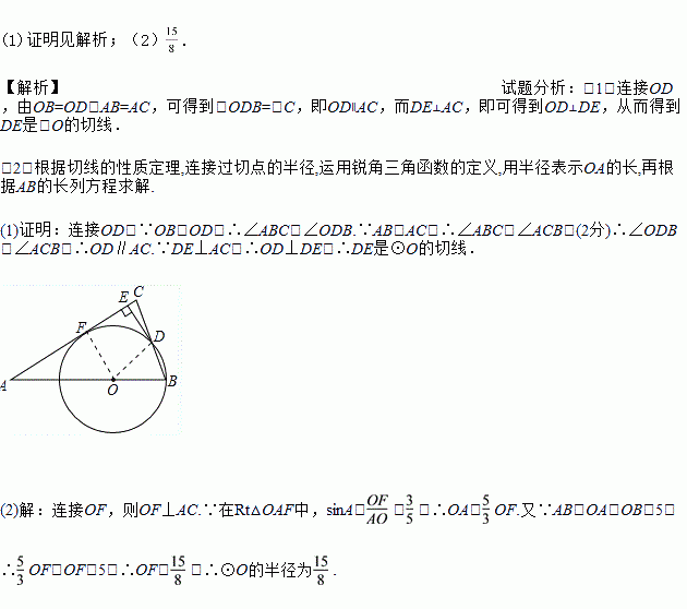 (2)若AC与⊙O相切于F,AB=5,sinA=