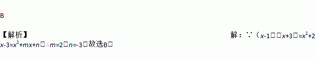 B 【解析】【解析】 ∵(x-1)(x+3)=x2+2x-3=x2+mx+n,∴m=2,n=-3.故选B.