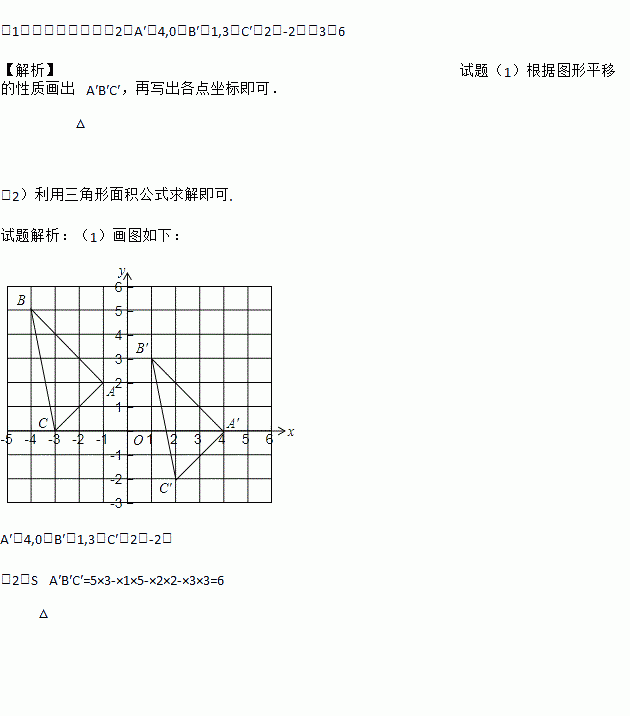 如图,将△ABC向右平移5个单位长度,再向下平移2个单位长度,得到△A′B′C′,请画出平移后的图形△A′B′C′并写出△A′B′C′各顶点的坐标.求出△A′B′C′的面积.