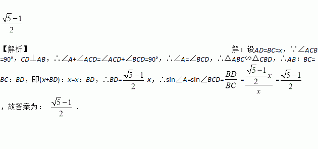 如图,Rt△ABC中,∠ACB=90°,CD⊥AB,垂足为点D,若AD=BC,则sin∠A=_____.