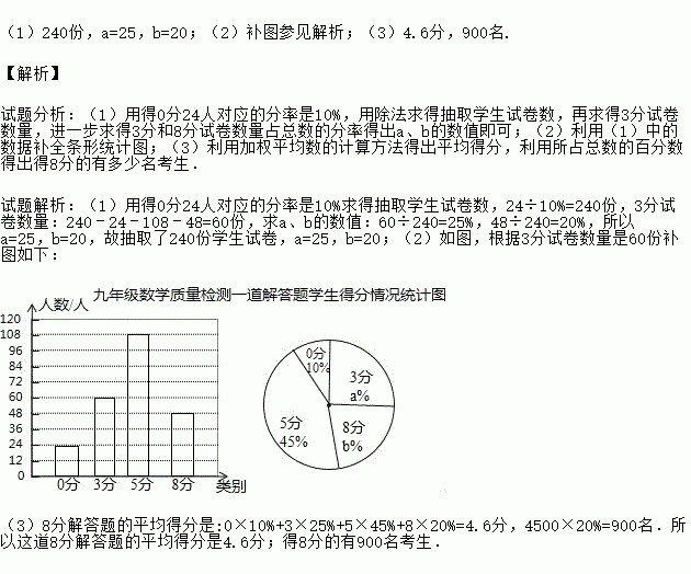 某地区在一次九年级数学质量检测试题中,有一道分值为8分的解答题,所有考生的得分只有四种,即:0分,3分,5分,8分,老师为了解本题学生得分情况,从全区4500名考生试卷中随机抽取一部分,分析、整理本题学生得分情况并绘制了如下两幅不完整的统计图:
