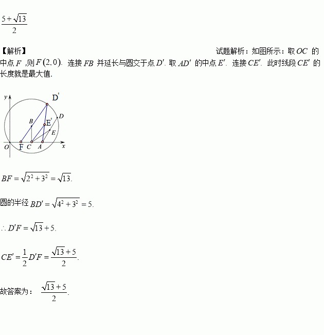 如图,已知A(6,0),B(4,3)为平面直角坐标系内两点,以点B圆心的⊙B经过原点O,BC⊥x轴于点C,点D为⊙B上一动点,E为AD的中点,则线段CE长度的最大值为_______.