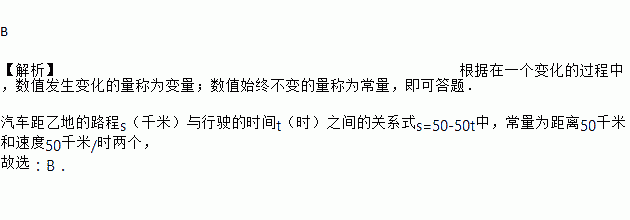 甲、乙两地相距50千米,若一辆汽车以50千米/时的速度从甲地到乙地,则汽车距乙地的路程s(千米)与行驶的时间t(时)之间的关系式s=50-50t中,常量的个数为( )
