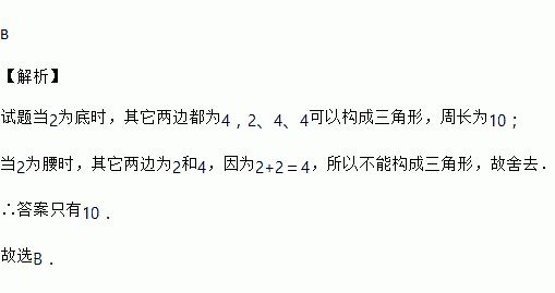 若一个等腰三角形的两边长分别为2和4,则这个等腰三角形的周长是为( )