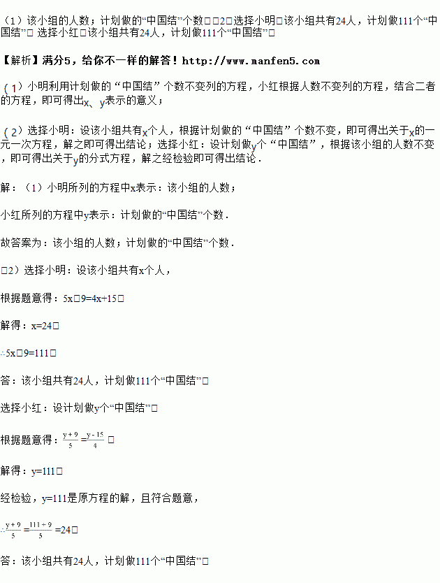 某小组计划做一批“中国结”,如果每人做5个,那么比计划多了9个;如果每人做4个,那么比计划少15个.该小组共有多少人?计划做多少个“中国结”?