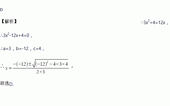 用公式法解方程3x2+4=12x,下列代入公式正确的是( )