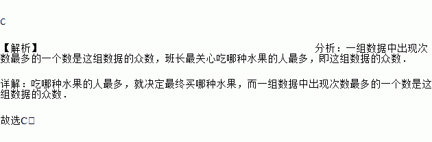 为筹备班级联欢会,班干部对全班同学最爱吃的水果进行了统计,最终决定买哪种水果时,班干部最关心的统计量是( )